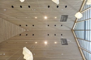 More than 6,500m2 of Derako® Solid Wood Linear systems were used – about 4,000m2 for ceilings and 2,500m2 for walls – crafted from Iarch and European pine. A mix of terracotta varnish, oak and white-stained finishes adds warmth and variation throughout the space. These finishes are featured in key zones such as the main entrance hall, circulation areas and auditorium.
