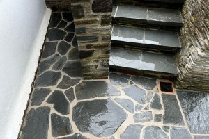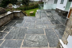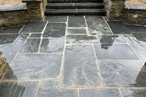This prestige holiday home overlooks the beautiful River Avon estuary in South Devon, and it underwent a major refurbishment in 2018, including repointing the extensive original natural slate pathways, patios and terraces, which were repointed using traditional cement-based pointing by the builders. Unfortunately, this feature paving continued to need more repairs and repointing in some areas every year, to the extent that by summer 2025, it was also becoming unsightly, with the patches and more areas of cracked, failing pointing, breaking up in the joints. As well as unsightly, it had also become dangerous and was potentially a hazard for guests, so the owners turned to Gorah Stone, specialist stone restoration contractors, and asked them for a more durable and permanent solution. This original slate paving was laid with random sized, shaped, and thickness of slate slabs, and the work had to be done quickly in October 2025, with a high risk of wet conditions in this exposed coastal location, which together presented several critical issues for successful paving jointing: